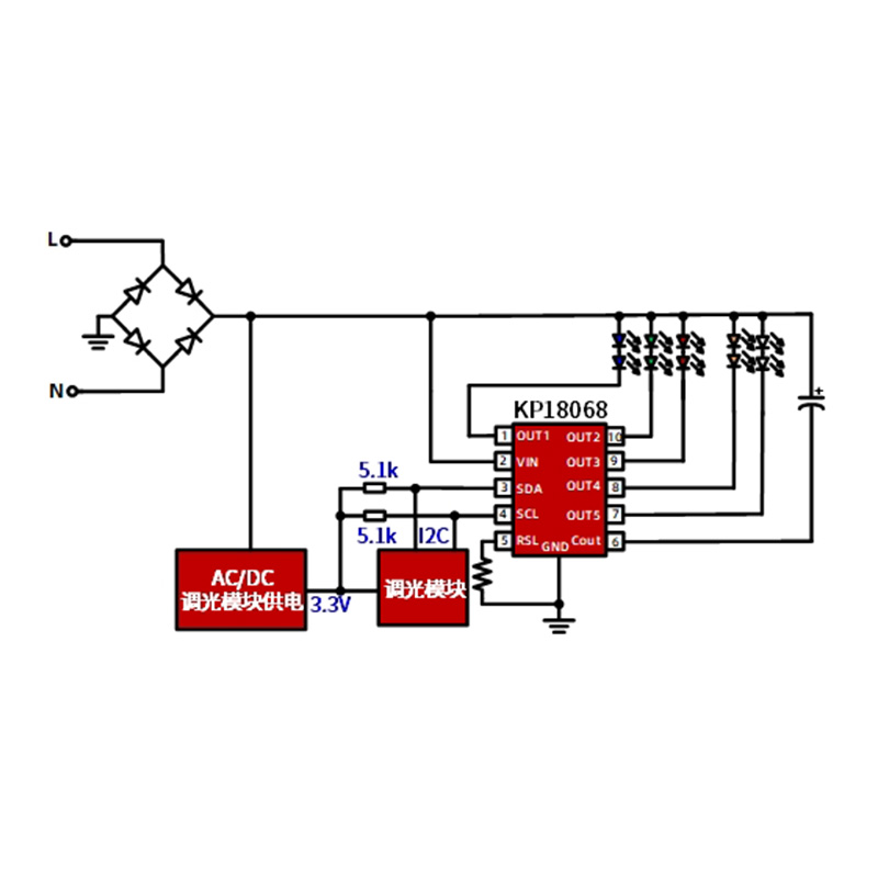 Схема CW KP18068ESPA може витримувати напругу 500 В і може отримувати живлення безпосередньо від входу змінного струму для керування лампою високої напруги, максимальний струм становить 77,5 мА; Схема RGB витримує напругу 500 В, максимальний струм 48 мА, щоб відповідати лінійному постійному струму високої напруги RGB. Перевагою KP18068 є висока точність постійного струму та глибина затемнення 0,1%.